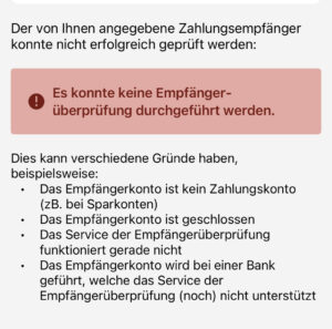 Sparkasse Bank, Unicredi Bank and Raiffeisen Bank in Germany and Austria do not perform “IBAN verification” for international transactions, but they just show an error as data does not match, as you can see in the images above.